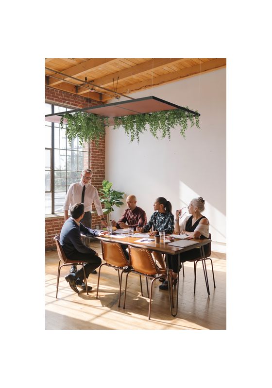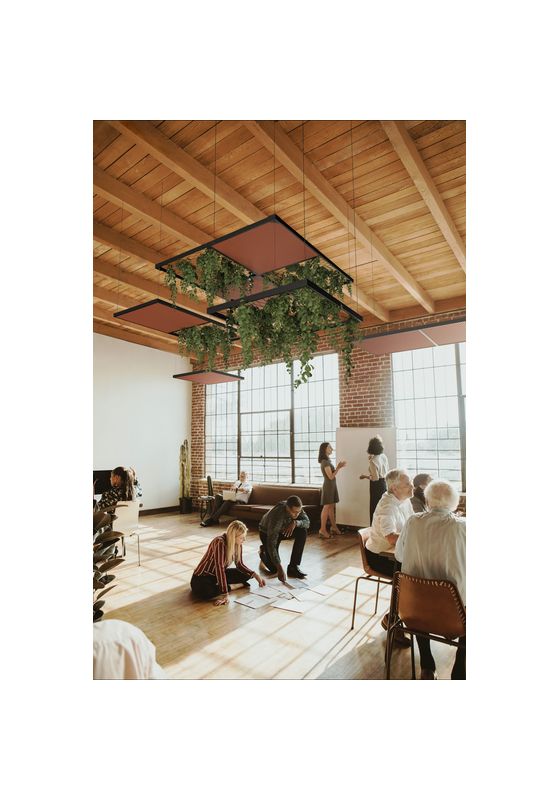 - The grid consists of 60×60 cm modules that can be filled with acoustic felt panels or open mesh inserts that can be decorated with plants.
